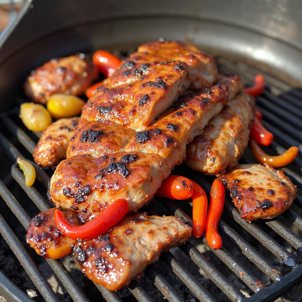 5. Después de cocinar, retira el cerdo de la bandeja y reserva la mezcla. Usa la bandeja para cocinar los pimientos directamente sobre la parrilla hasta que estén tiernos y ligeramente quemados.