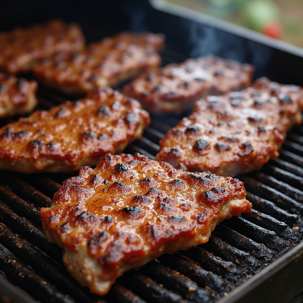 - Prepara una parrilla o barbacoa a fuego medio-bajo. Retira la carne de la marinada, reservando el líquido para basting (mojar) durante la cocción.