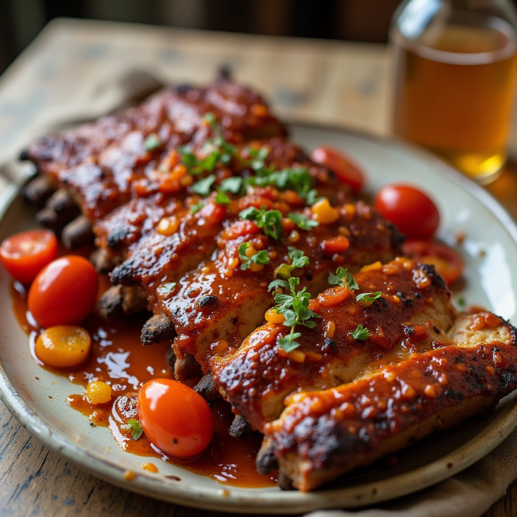 - Calienta una parrilla o sartén a fuego medio-bajo. Asegúrate de que la superficie esté limpia y ligeramente engrasada con aceite de oliva. Añade las costillas o el lomo marinado a la parrilla, cocinando lentamente hasta que esté tierna y dorada por fuera, aproximadamente 20-30 minutos por lado (ajusta el tiempo según el tipo de carne). Si lo prefieres, puedes usar un horno a baja temperatura para una barbacoa más tradicional.