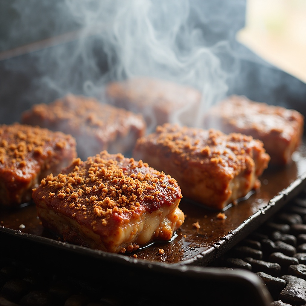 - Coloca la bandeja en la parrilla o ahumador, asegurándote de que haya suficiente espacio para el flujo de humo. Asegura que no esté demasiado cerca del fuego para evitar quemar la carne.