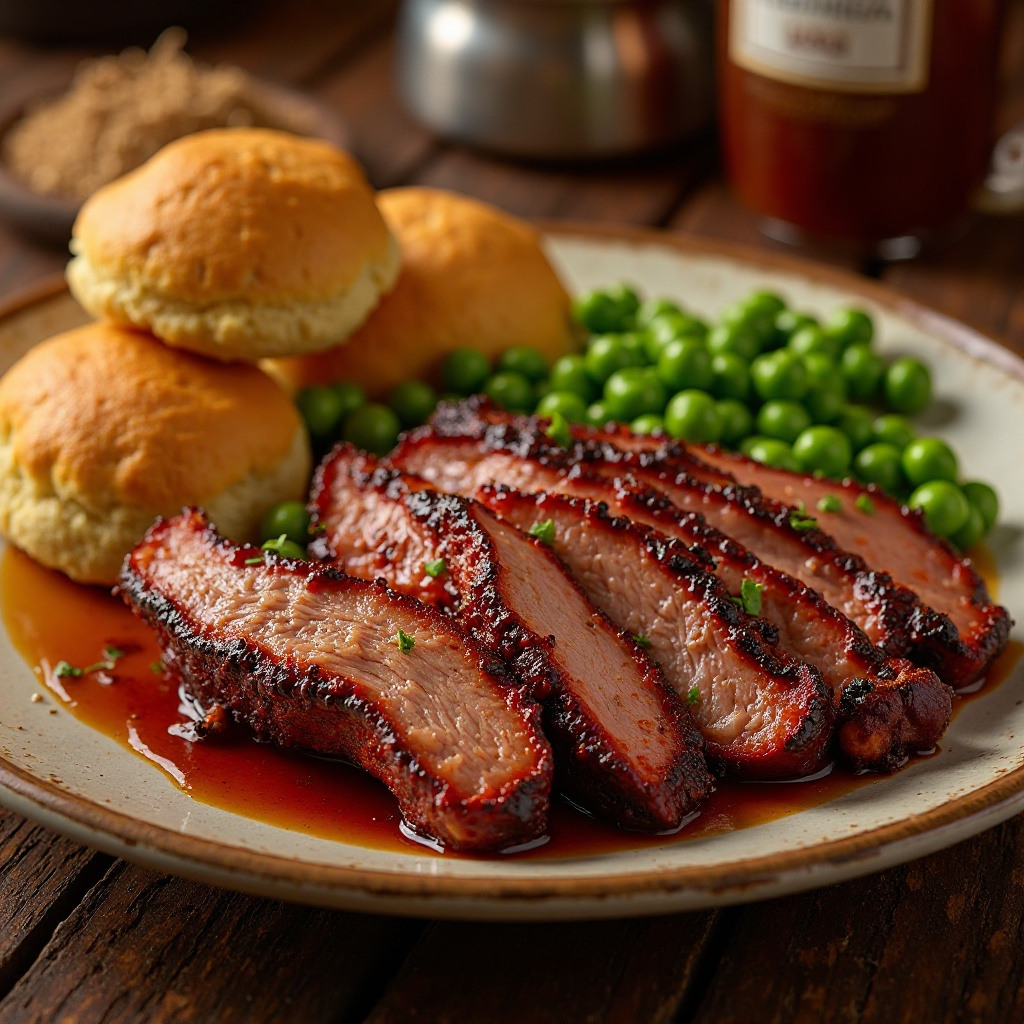 8. Una vez que la barbacoa esté lista, retira la carne del horno y déjala enfriar ligeramente antes de cortarla en cubos o rodajas. Sirve con panecillos de pan de maíz y guisantes verdes para disfrutar de un plato auténtico de Talladega.