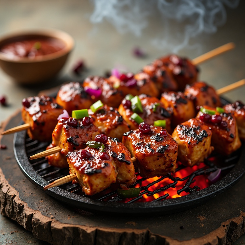 - Prepara una parrilla ahumada o coloca las brochetas con el pollo marinado. Asegúrate de que la parrilla esté a una temperatura adecuada para barbacoa (165°F/74°C en el centro del pollo).