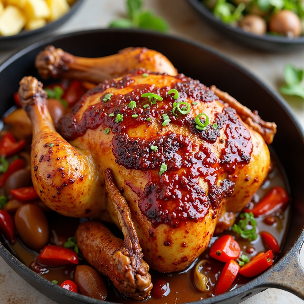 5. Cocina el pollo durante aproximadamente 1 hora y media o hasta que esté bien cocido (la temperatura interna del pollo debe ser de al menos 165°F/74°C). Durante la cocción, bátelo ocasionalmente para asegurar que se cubra con salsa y mantenga la humedad.