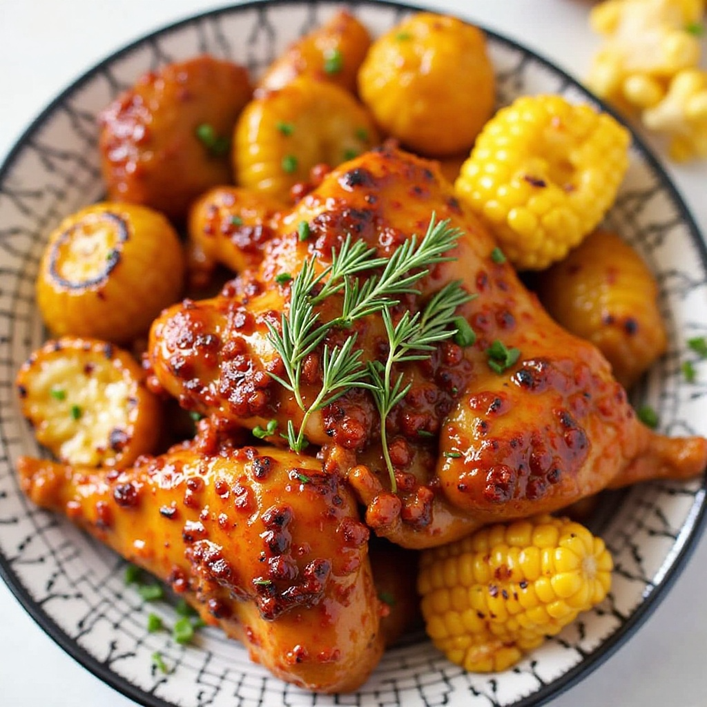 - Sirve el pollo junto con papas asadas y maíz al horno. Agrega una hoja de hierbas frescas si lo deseas para una presentación más auténtica.
