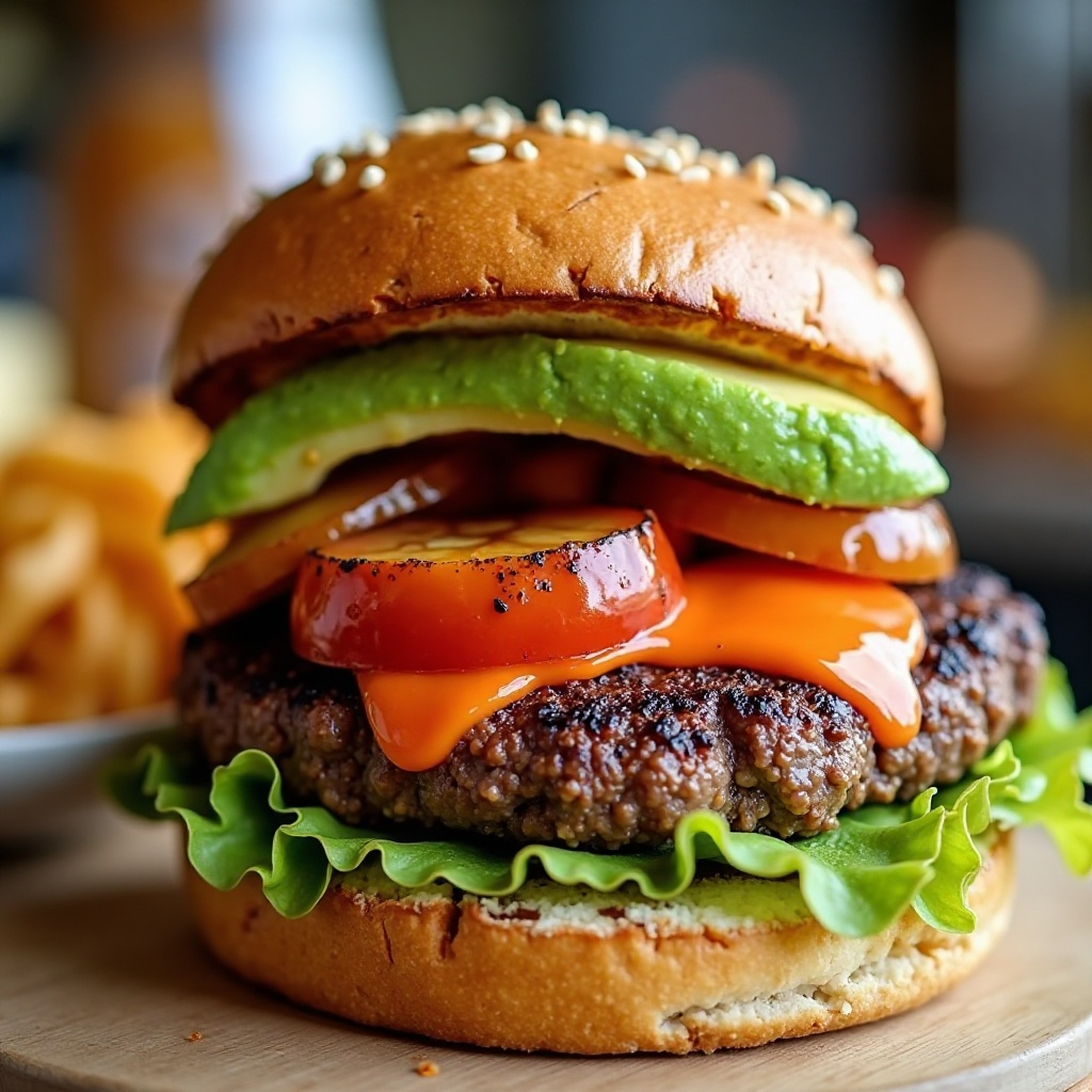 - Distribuye la salsa Buffalo picante sobre la hamburguesa, dejando un espacio para el aguacate y el tomate si lo deseas.