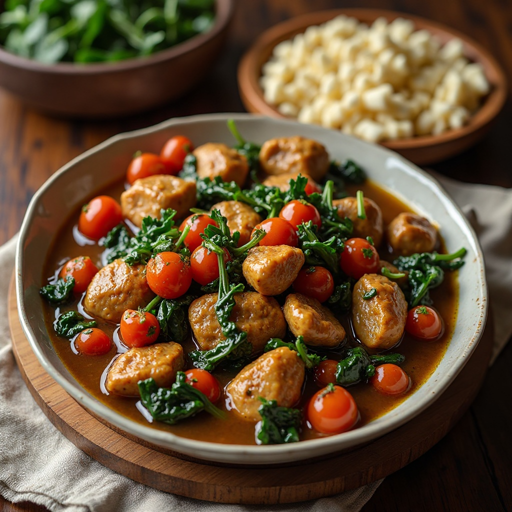 - Añade las espinacas, los tomates y las dos tazas de agua o caldo. Cubre la sartén con una tapa y cocina a fuego medio por aproximadamente 20 minutos, hasta que la carne esté tierna y los vegetales estén suaves.
