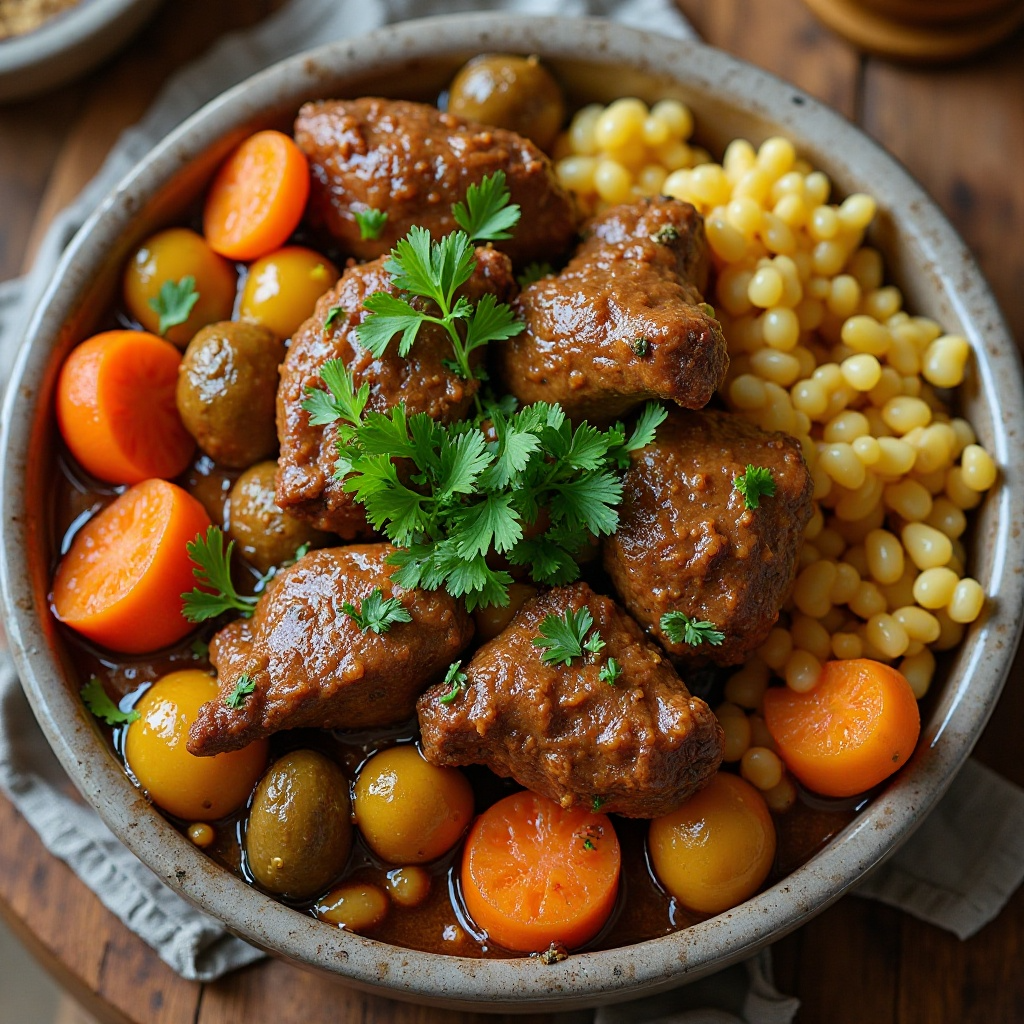 1. En una olla grande, coloca el agua y los trozos de carne. Añade las especias (comino, cúrcuma, sal y pimienta) y deja cocinar a fuego medio durante aproximadamente 1 hora, o hasta que la carne esté tierna.