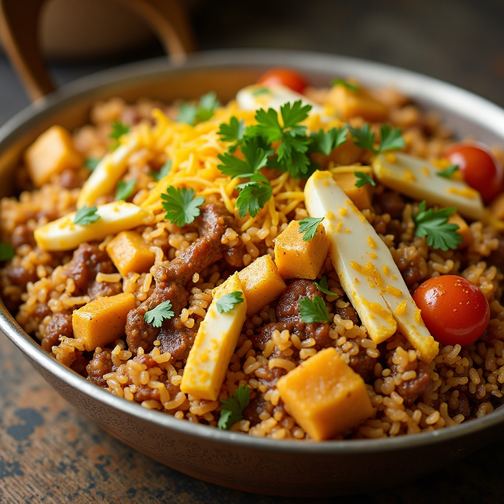 Este biryani es rico en proteínas y contiene una variedad de especias que ofrecen beneficios antioxidantes y antiinflamatorios. El queso Qehwa, aunque cremoso, es bajo en grasa y alto en proteínas, lo que lo convierte en una opción saludable para aquellos que buscan mantener una dieta equilibrada. Reducir el aceite de oliva o optar por alternativas más saludables puede adaptar este plato a dietas específicas.