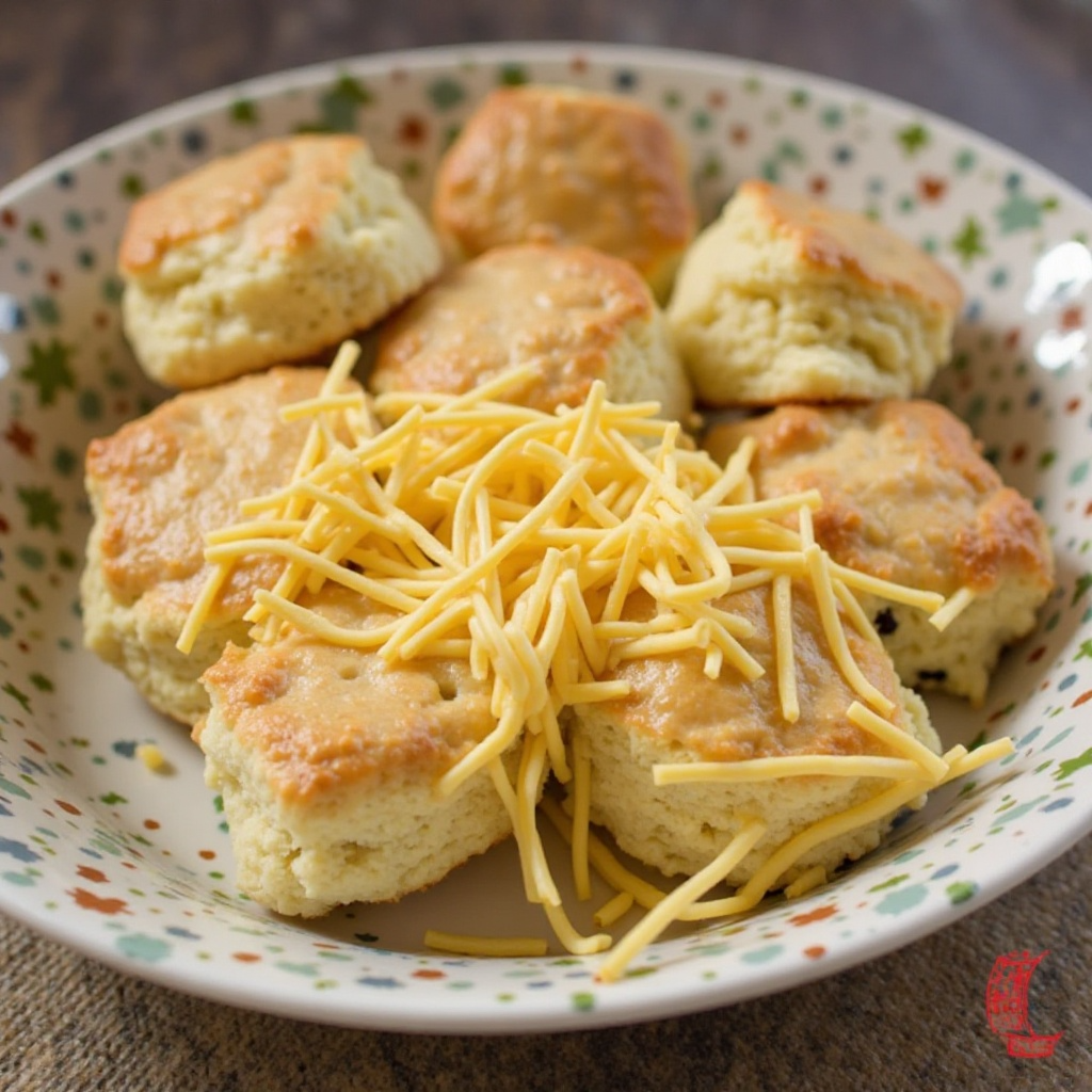 - Mientras tanto, cuando los biscuits estén listos, colócalos en una fuente para servir. Sirve el gravy caliente por encima de cada biscuit, asegurándote de que el queso cheddar se derrita un poco al contactar con el gravy caliente.