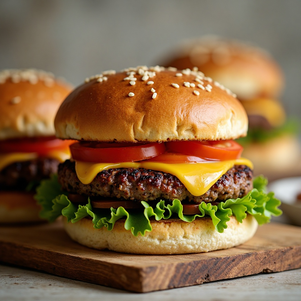 - Coloca las hamburguesas en los panes de hamburguesa y añade tus toppings favoritos: lechuga, tomate y queso cheddar. Sirve caliente.