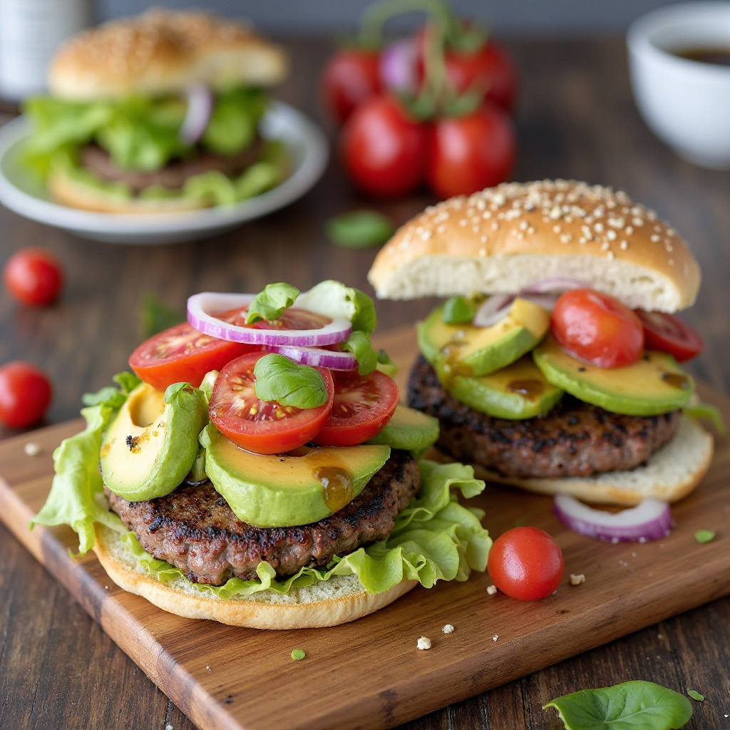 - Monta las hamburguesas: En cada pan de hamburguesa, coloca un bisonte cocido y añade aguacate picado, hojas de lechuga romana y tomate cherry. Si lo deseas, añade una cucharada de mantequilla de tomate.