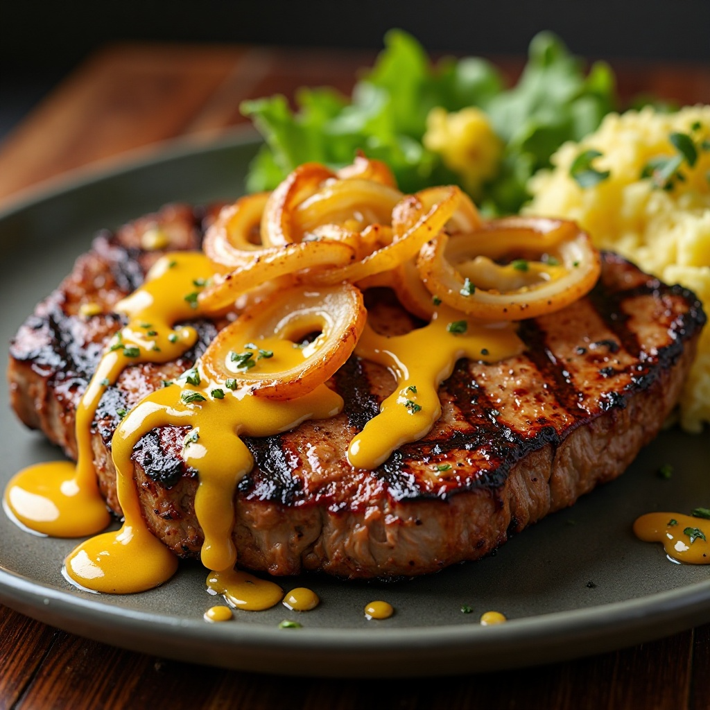Receta de Bistec de Bisonte a la Parrilla con Salsa de Mostaza y Cebolla Caramelizada