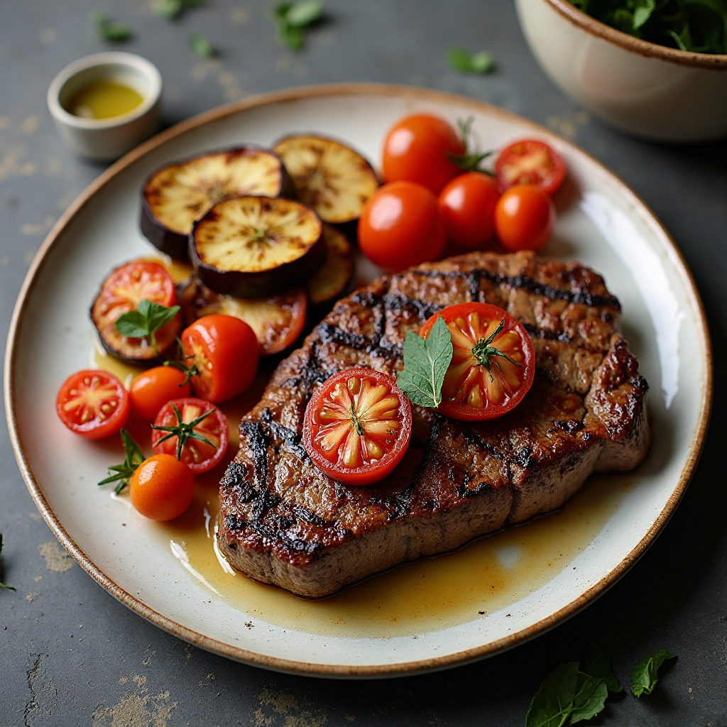 El bistecca alla fiorentina es un plato emblemático de la región de Toscana, en Italia. Este corte de carne, conocido como «bistec», se caracteriza por su grosor y se cocina a la parrilla, a menudo con poco o ningún aderezo para realzar su sabor natural. Añadimos berenjena a esta receta para darle un toque mediterráneo y saludable, manteniendo el espíritu de la carne toscana.
