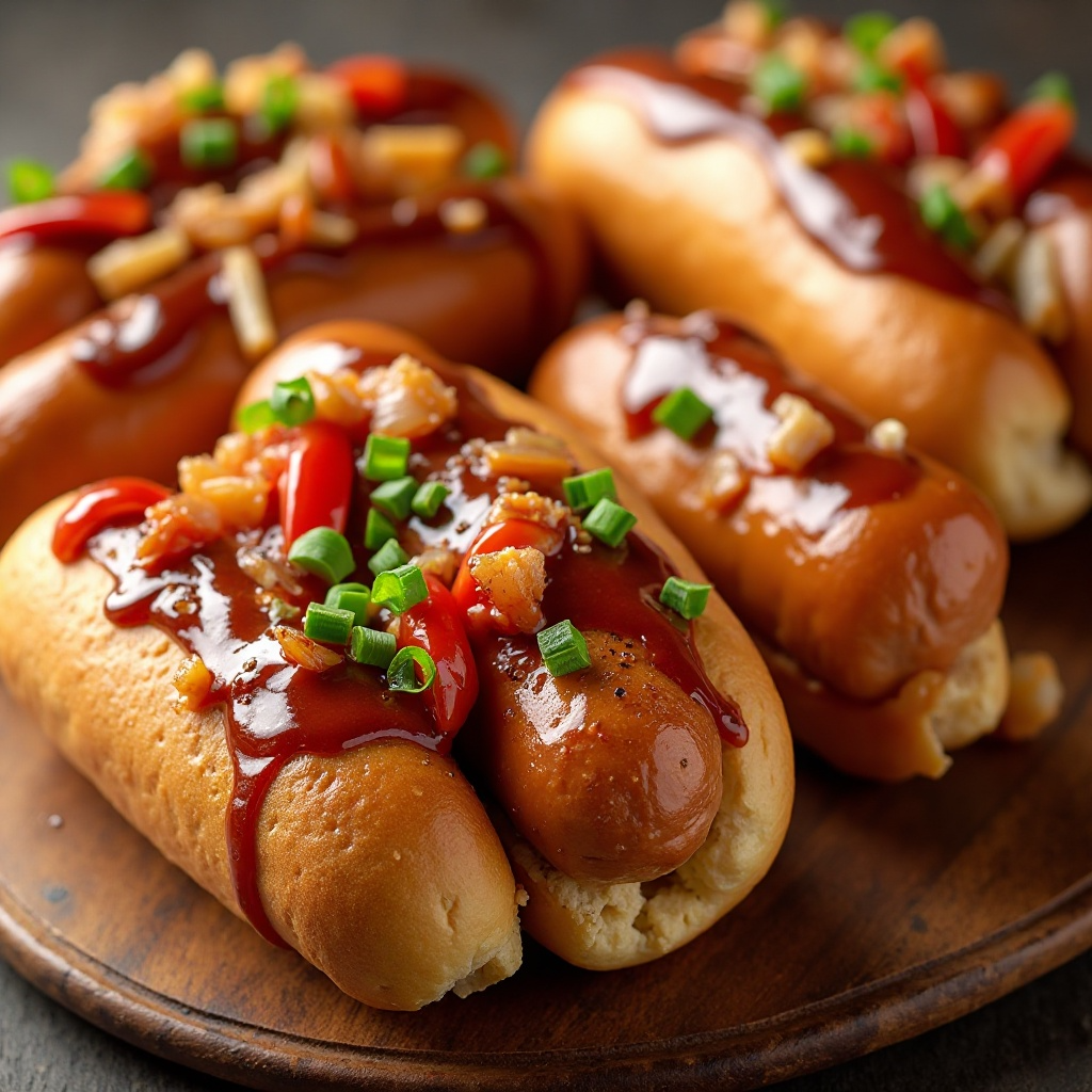 - Distribuye la salsa barbecue caliente sobre cada salchicha, asegurándote de que cubra bien toda la superficie.