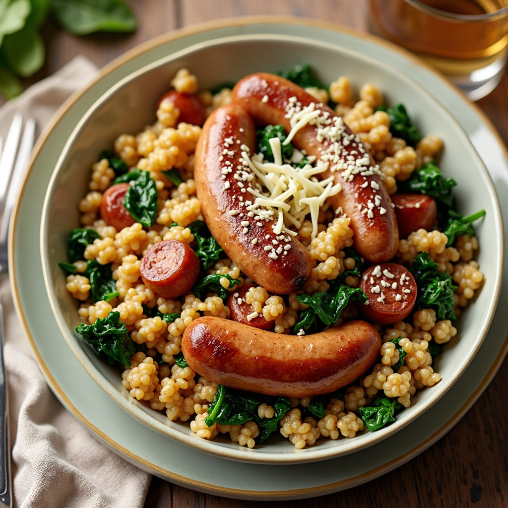 Este plato combina proteínas magras de las espinacas y los bratwursts, junto con los beneficios del arroz integral que aportan fibra y energía sostenida. La opción de servir con queso derretido es opcional para ajustar el contenido de grasas y calorías según las preferencias dietéticas.
