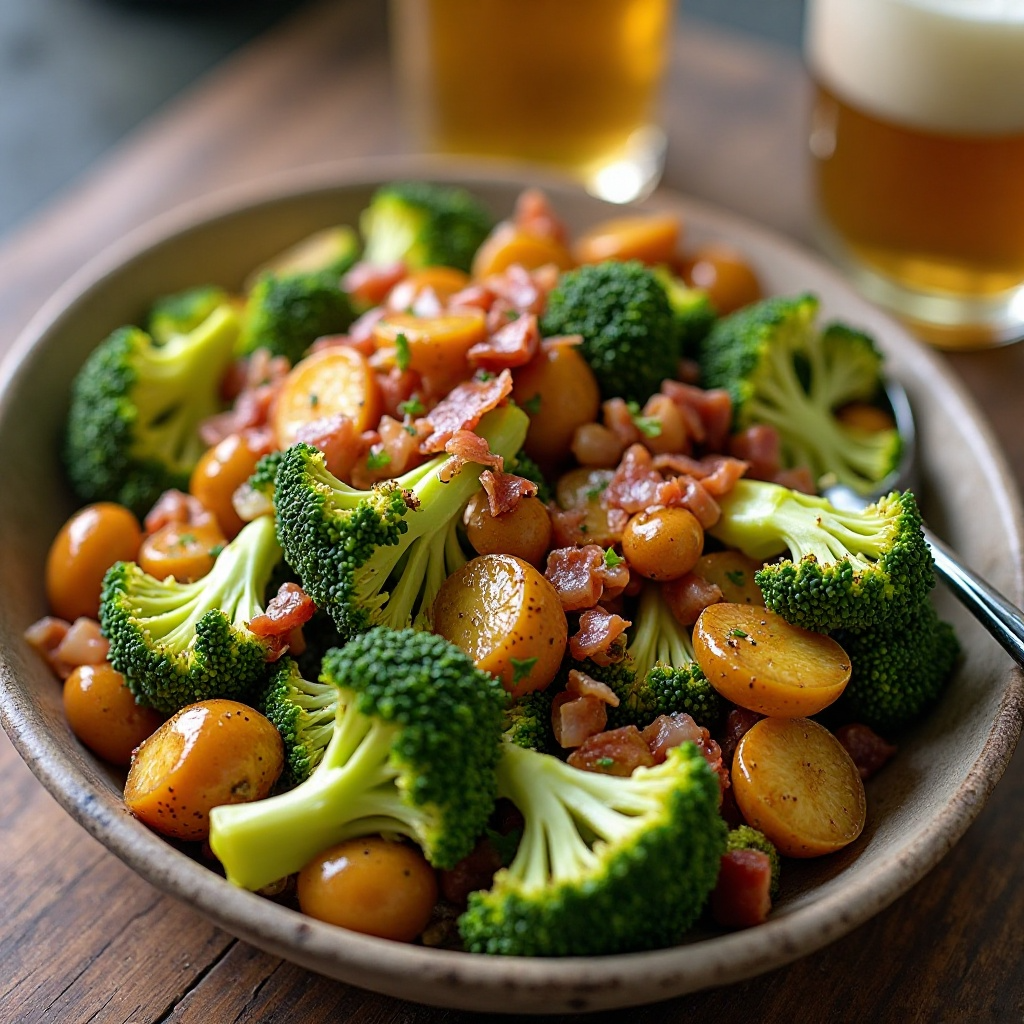 - Sirve la mezcla de brócoli y patata con la salsa de cerveza belga de Arlon. Añade el tocino o la panceta por encima para terminar el plato.