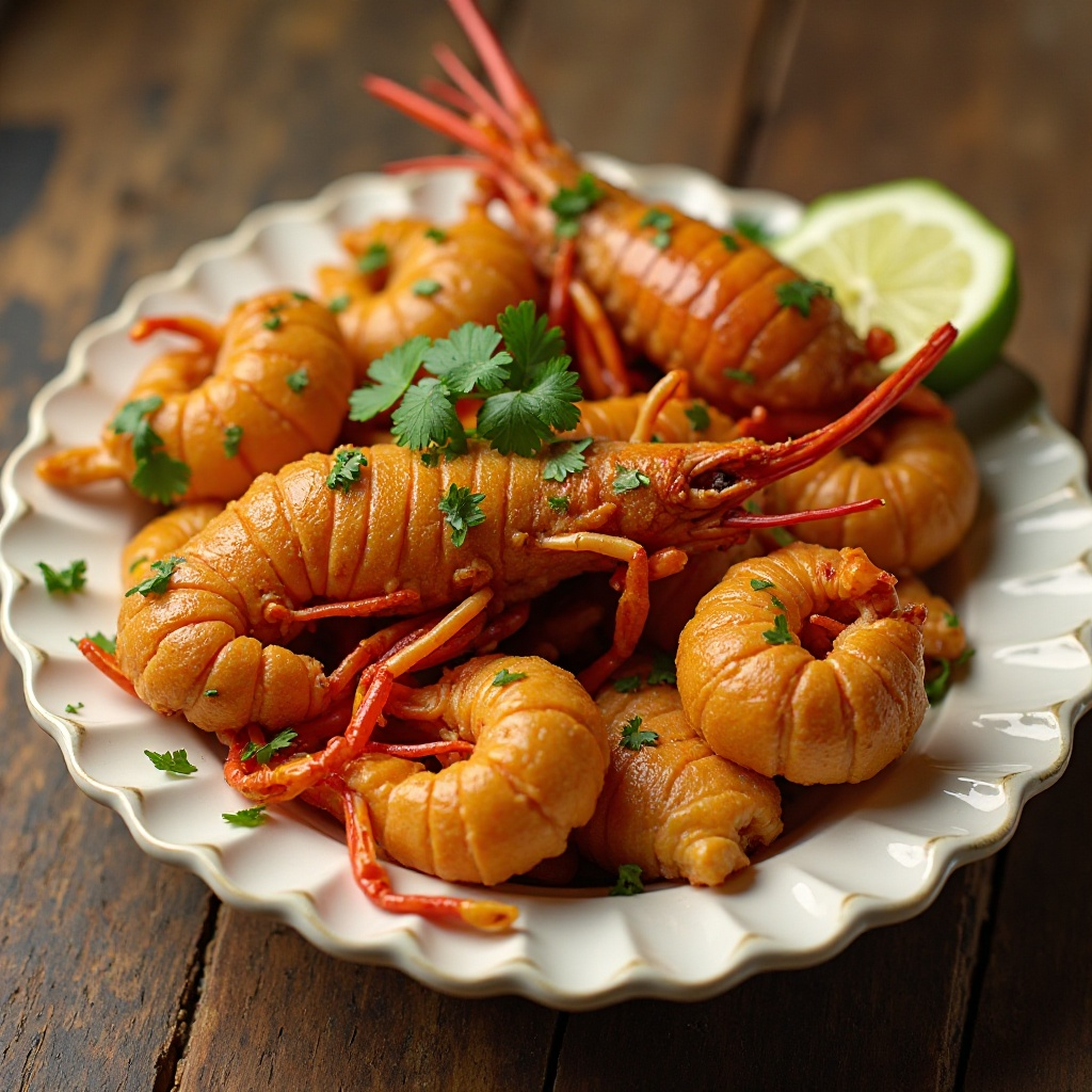 7. Sirve las porciones fritas de crawfish en un plato, decoradas con cilantro fresco picado y servidas con jugo de lima fresco para añadir un toque final de sabor.