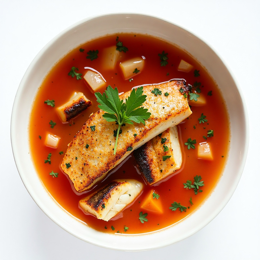 - Sirve el caldito caliente, junto con los filetes de pescado cocidos. Decorar con perejil fresco picado y disfrutar de este reconfortante plato mediterráneo.