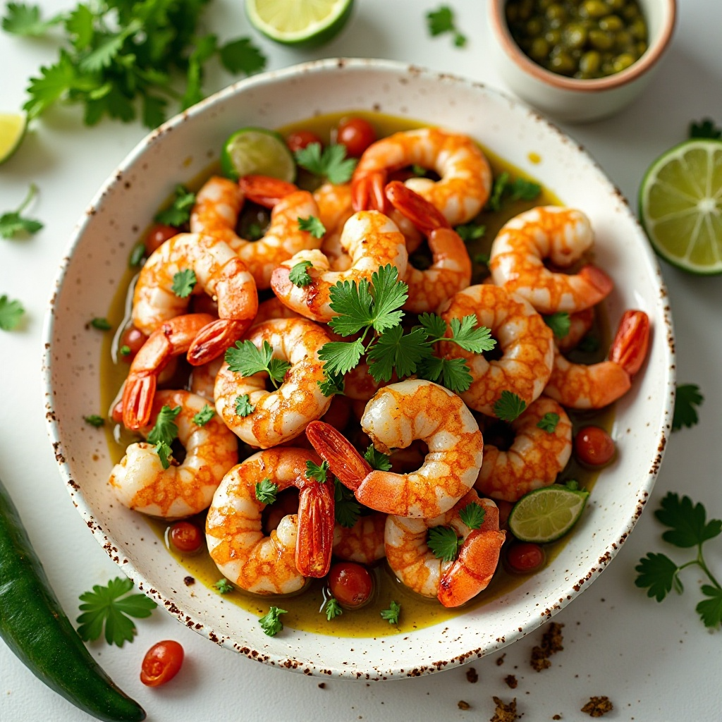 El camarón es una fuente rica de proteínas y omega-3, esenciales para la salud del corazón. La salsa tomatillo y los ajíes ofrecen beneficios antioxidantes, mientras que el cilantro agrega un toque fresco y saludable. Para adaptar esta receta a necesidades dietéticas específicas, puedes ajustar la cantidad de ingredientes picantes o utilizar camarones enlatados para una versión menos fresca.