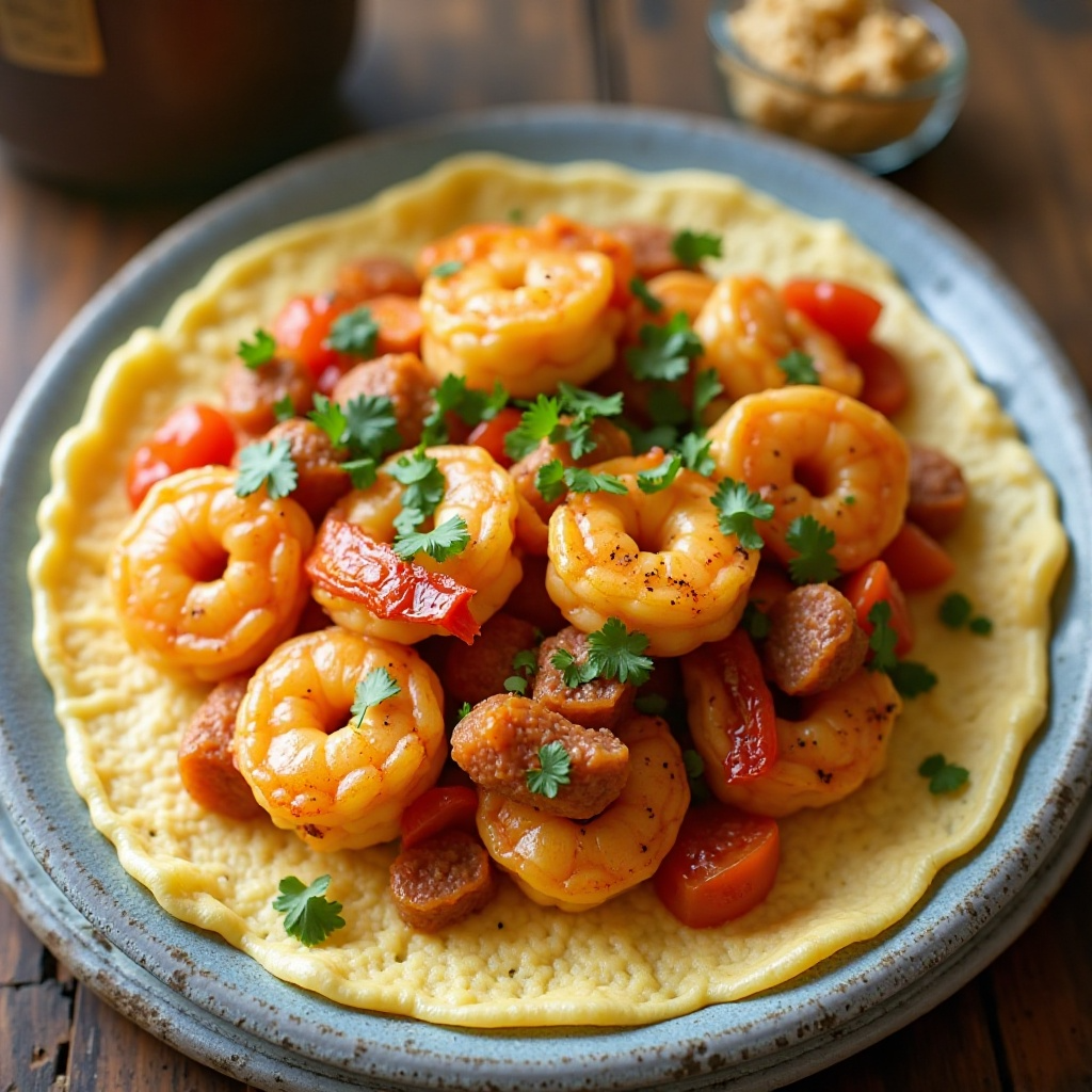 Aunque la combinación específica de camarones y chorizo no es tradicional en Colombia, donde los platos son más simples y el uso de condimentos suele ser moderado, esta receta refleja la influencia culinaria de otras partes del mundo, especialmente Estados Unidos, en la cocina colombiana contemporánea. La arepa es un pilar de la dieta colombiana, especialmente en regiones costeras, mientras que el chorizo es popular en todo el país, siendo una opción versátil para muchos platos.