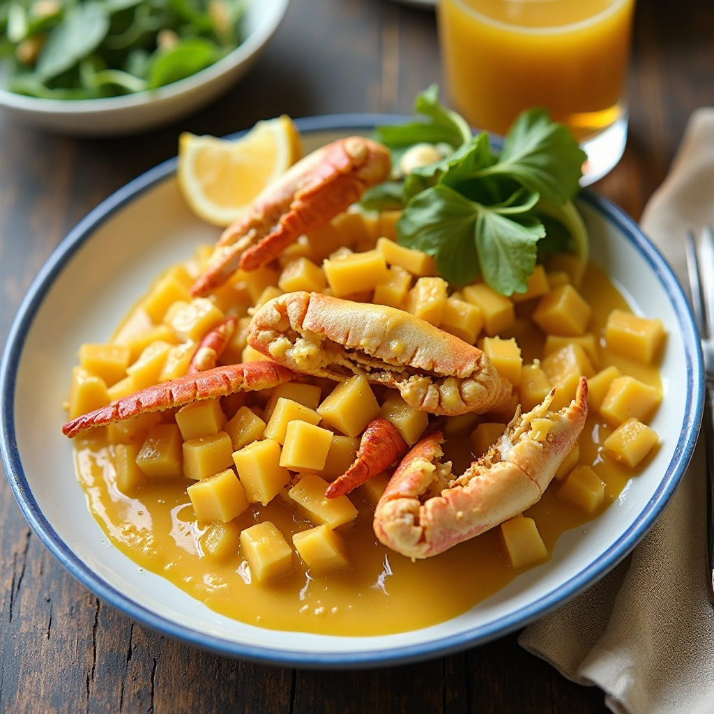 El cangrejo azul de Chesapeake es una variedad emblemática del estuario de la bahía de Chesapeake, conocida por su textura firme y sabor a marino. En St. Michaels, Maryland, esta región se enorgullece de preparar este crustáceo con recetas que realzan su sabor natural. Esta receta presenta un cangrejo azul cocido al estilo local con una salsa de mango cremosa, ideal para un almuerzo o cena ligera.