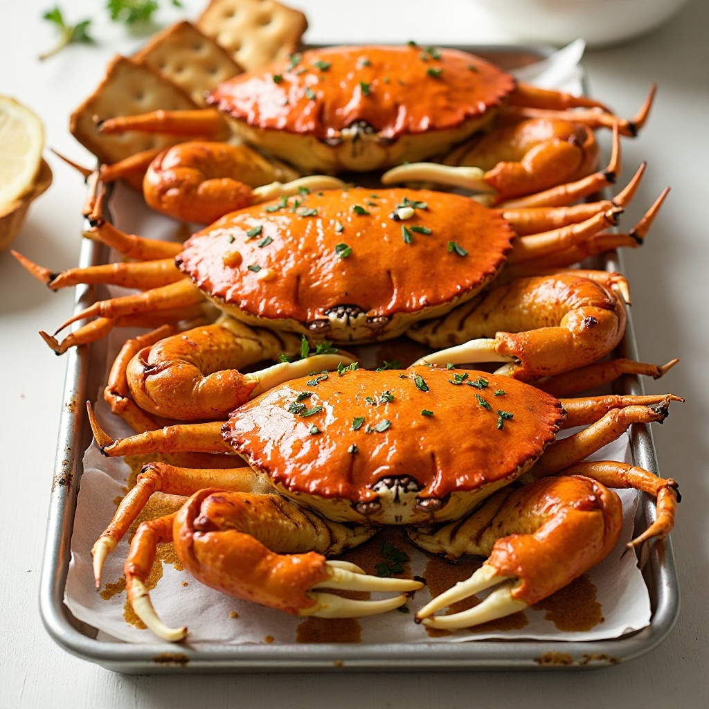 - Hornear a 375°F (190°C) durante aproximadamente 25-30 minutos o hasta que los cangrejos estén cocidos y el exterior tenga un color dorado.