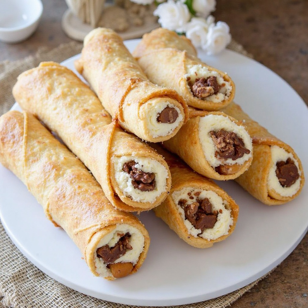 3. Llena un molde de canoli con el relleno preparado y coloca una tira de masa enrollada dentro, asegurándola con un palillo o banda de cocina.