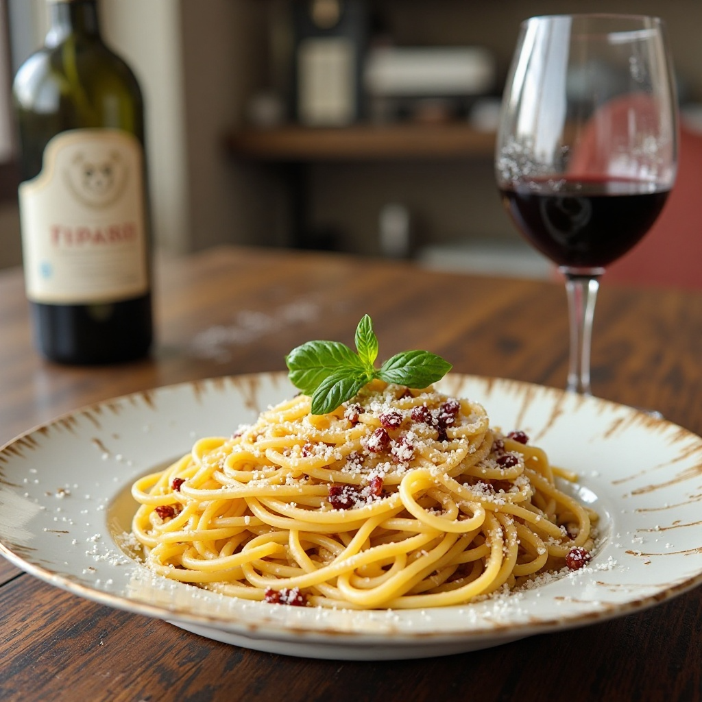 La carbonara es un plato icónico de Italia, particularmente famoso en Roma. Originariamente, se prepara con huevos, queso pecorino, pancetta o jamón y pasta. En esta versión, hemos incorporado un toque distintivo con vino de Cerdeña, una región conocida por sus robustos y afrutados vinos que añaden una complejidad nueva al sabor clásico de la carbonara.