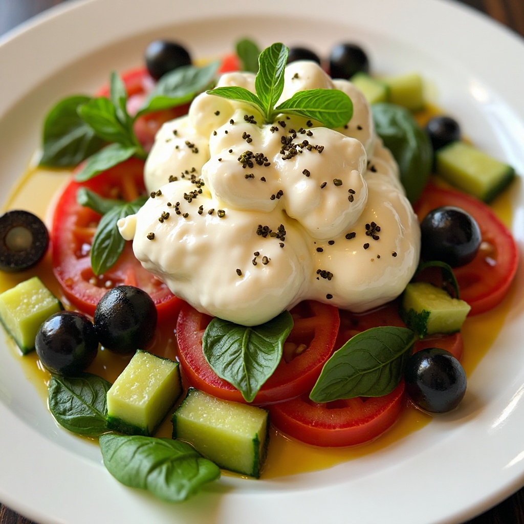 En Bari, una ciudad costera de Italia, el Caprese se transforma con la inclusión de burrata, un queso mozzarella italiano cremoso y suave que realza el sabor de la receta clásica. Este plato es ideal para disfrutar de los sabores frescos de la temporada, especialmente durante los meses de verano.