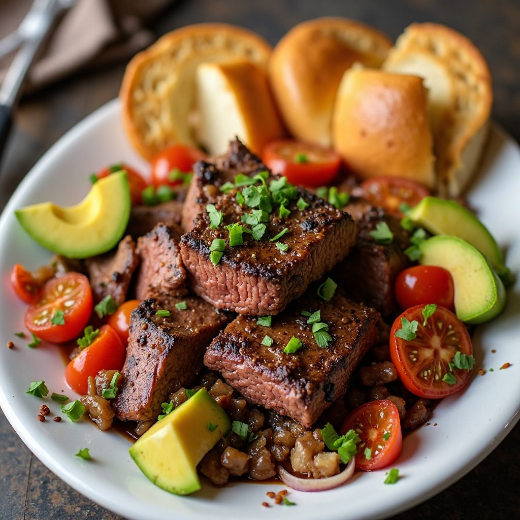5. Sirve la carne asada caliente y coloca la cebolla a los lados. Para el topping, agrega rodajas de tomate y cubos de aguacate. Corta el pan de molde en rebanadas y unta con mantequilla antes de calentarlas hasta que estén crujientes.