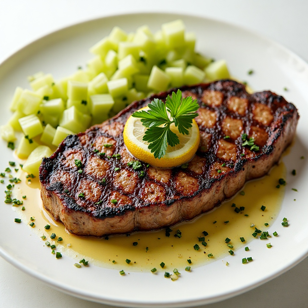 - Una vez cocida la carne, retírala de la parrilla o sartén y deja reposar por unos minutos para mantener la jugosidad. Sirve los filetes junto a la salsa de apio fresca, decorada con perejil fresco picado.