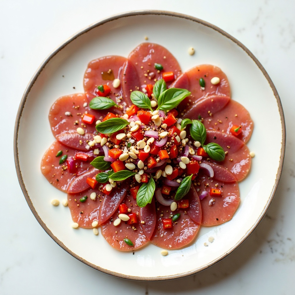 En el corazón de la región de las Grandes Llanuras, en Rawlins, Wyoming, se pueden encontrar platos que destacan la carne de bisonte, un ingrediente emblemático de la región. Este carpaccio de bisonte es una presentación elegante y fresca que captura la esencia del sabor del bisonte con notas a cítricos y hierbas frescas.