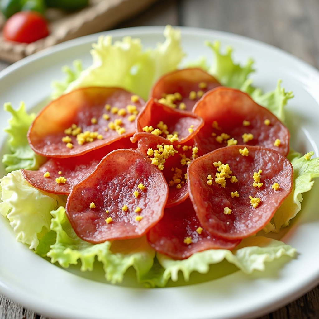 El carpaccio di salame di Ascoli es un plato elegante y refinado que destaca la calidad del salame típico de la región italiana de Ascoli Piceno. Este plato, originario de los tiempos de corte italiano, presenta el salame en rodajas finas sobre una cama de lechuga fresca, un toque de aceite de oliva y ralladura de limón para realzar su sabor ahumado y picante característico.