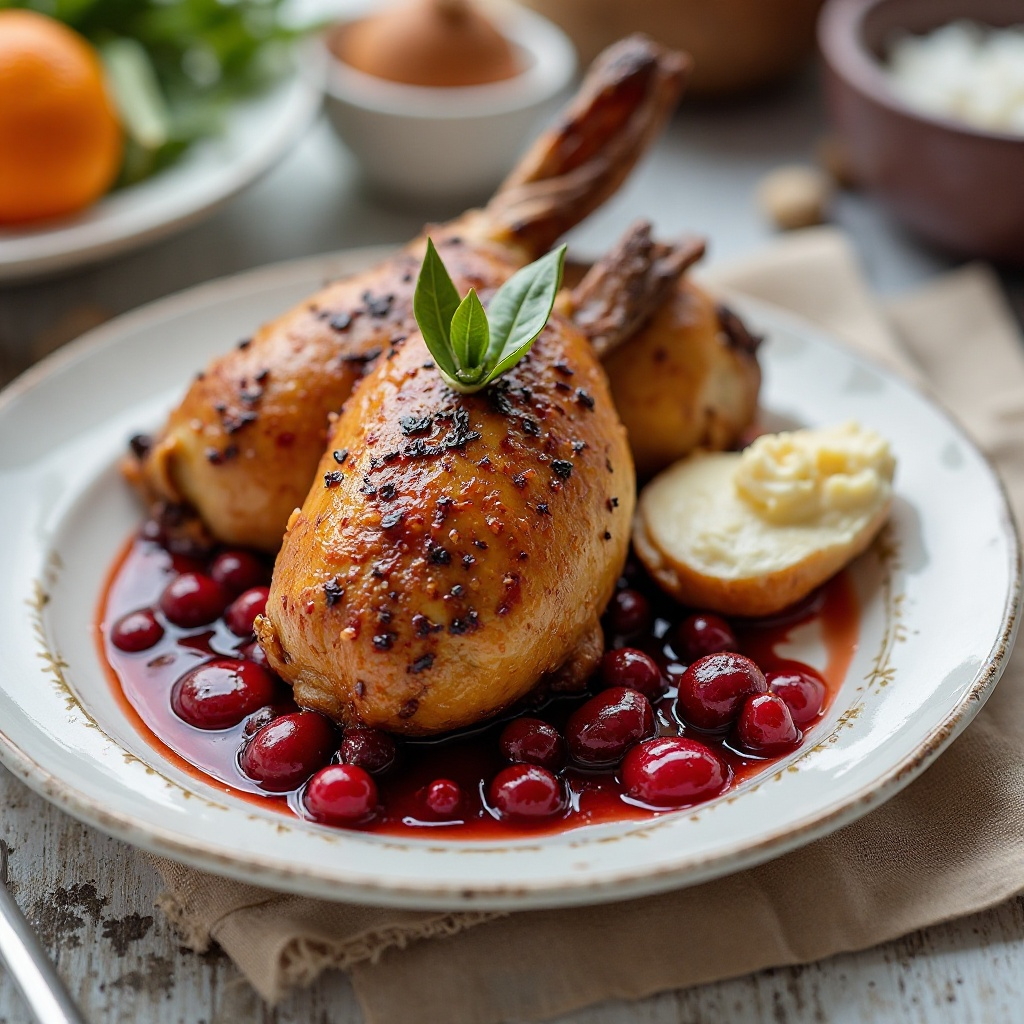 El conejo es una fuente de proteínas magras con bajo contenido en grasa saturada, lo que lo hace ideal para una dieta saludable. La salsa de cranberry añade antioxidantes y un toque dulce sin azúcares añadidos, contribuyendo a un balance nutritivo. El uso de mantequilla de trigo, en lugar de mantequilla tradicional, ayuda a reducir las grasas saturadas.