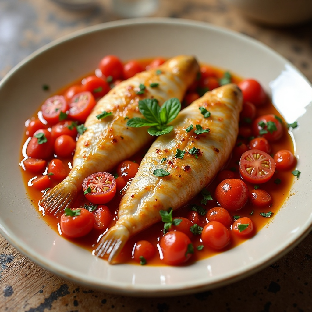 - Una vez dorado por un lado, agrega los filetes a la mezcla de tomates en la sartén y cocina a fuego medio durante 5-7 minutos, o hasta que el pescado esté cocido.
