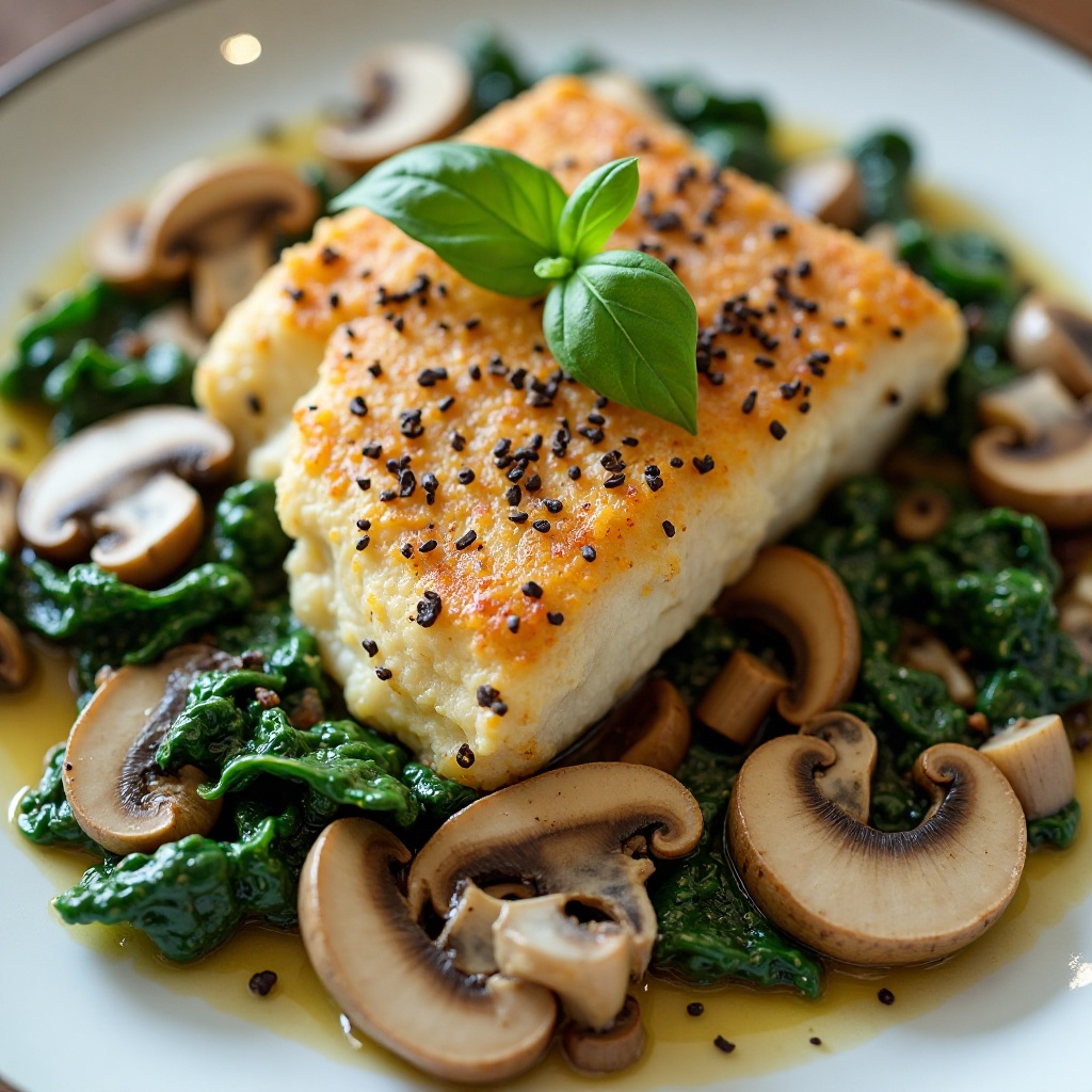 Receta de Cazón al Horno con Salsa de Espinacas y Champiñones para el Lago de los Esclavos, Ontario, Canadá