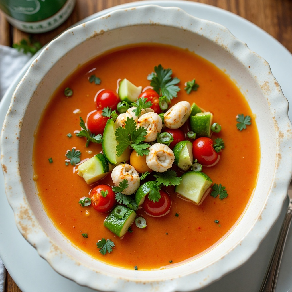 El gazpacho es una comida saludable y ligera, rica en antioxidantes gracias a los tomates cherry y pepino. La cerveza artesanal utilizada aquí aporta proteínas y minerales como el zinc y el magnesio. Sin embargo, la cerveza contiene alcohol, por lo que se recomienda moderación. Asegúrate de utilizar una cerveza baja en calorías si estás buscando una opción más ligera.