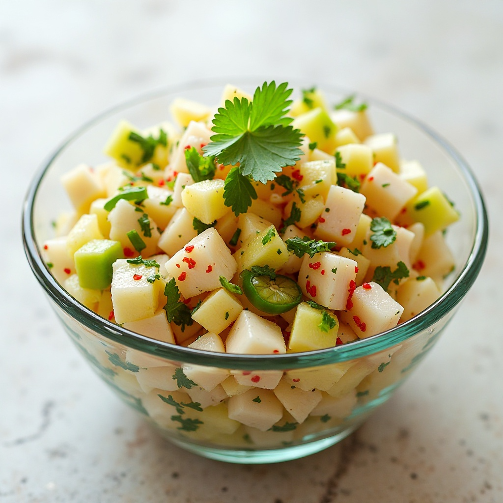 En Manzanillo, México, el ceviche ha sido adaptado con ingredientes locales que reflejan la diversidad de sabores regionales. La inclusión de manzana destaca la creatividad culinaria local y su capacidad para transformar un plato tradicional en una expresión única de la región. Este plato es una muestra del amor por los sabores frescos y la adaptación de recetas a los ingredientes disponibles, un aspecto fundamental de la cultura gastronómica mexicana.