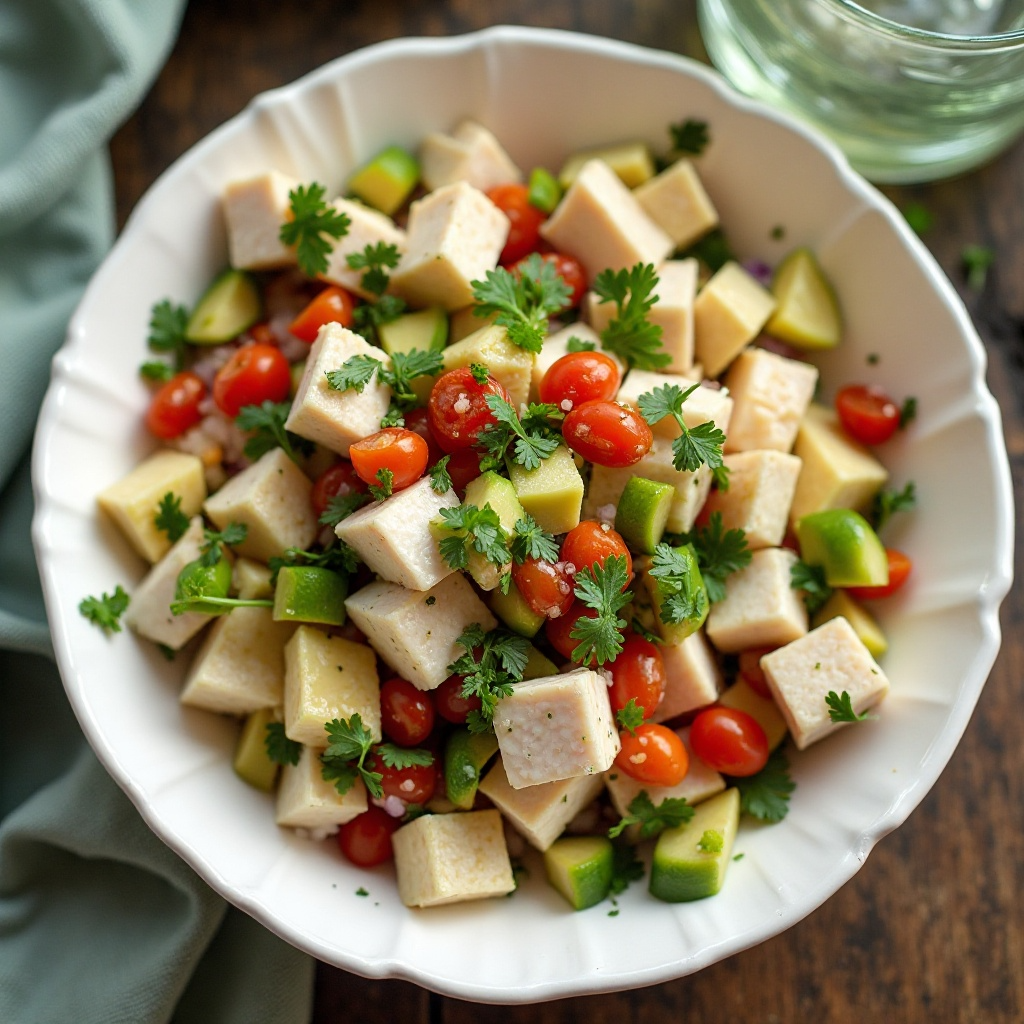 El ceviche con pescado del lago Winnipeg es una fuente rica de proteínas y ácidos grasos omega-3, esenciales para la salud cardiovascular. Los ingredientes frescos como el aguacate y los vegetales aportan fibra y antioxidantes, mientras que el jugo de limón contribuye a la digestión saludable. Para una versión más ligera, puedes ajustar la cantidad de aceite de oliva o utilizar aceite de oliva con bajo contenido en calorías.