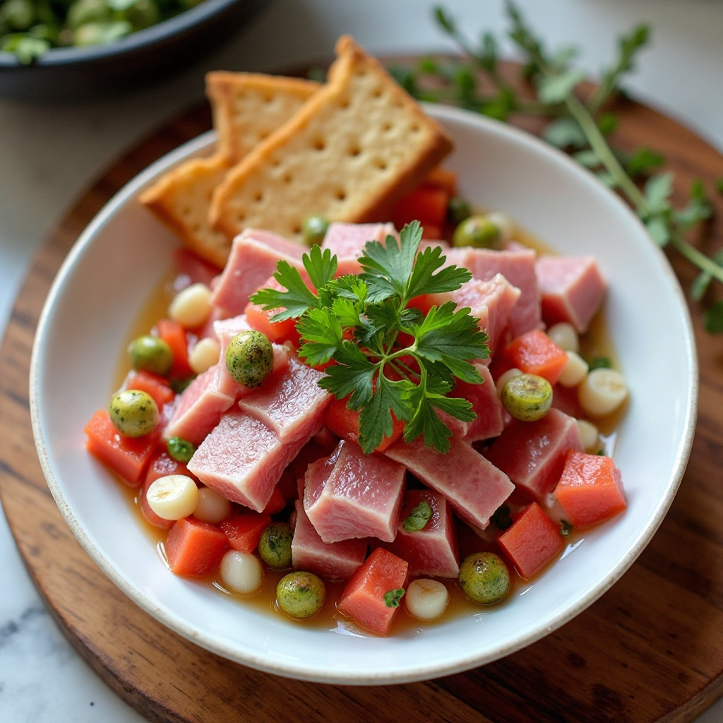 Este ceviche es un toque moderno y refrescante para los amantes de la comida fresca y saludable. Inspirado en la rica tradición de preparar ceviche en San José, California, este plato utiliza atún fresco y una infusión única de vinos del Valle de Santa Clara, conocido por sus sabores terrosos y complejos. Ideal para disfrutar con amigos o como entrada ligera en una cena.