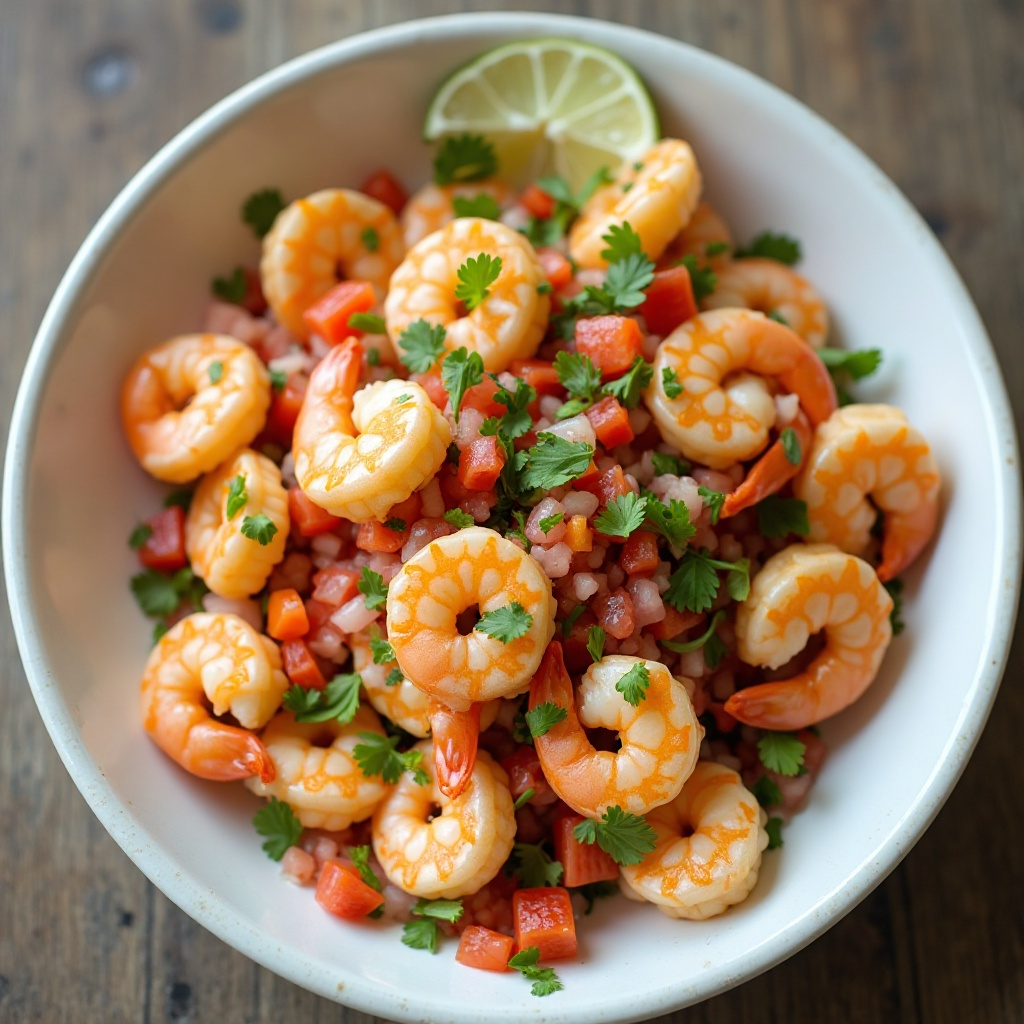 El ceviche es una fuente rica en proteínas y ácidos grasos omega-3 gracias a los camarones. Los vegetales aportan vitaminas y antioxidantes esenciales. Para una versión más ligera, puedes reducir la cantidad de aceite de oliva y ajustar el nivel de acidez a tu gusto.