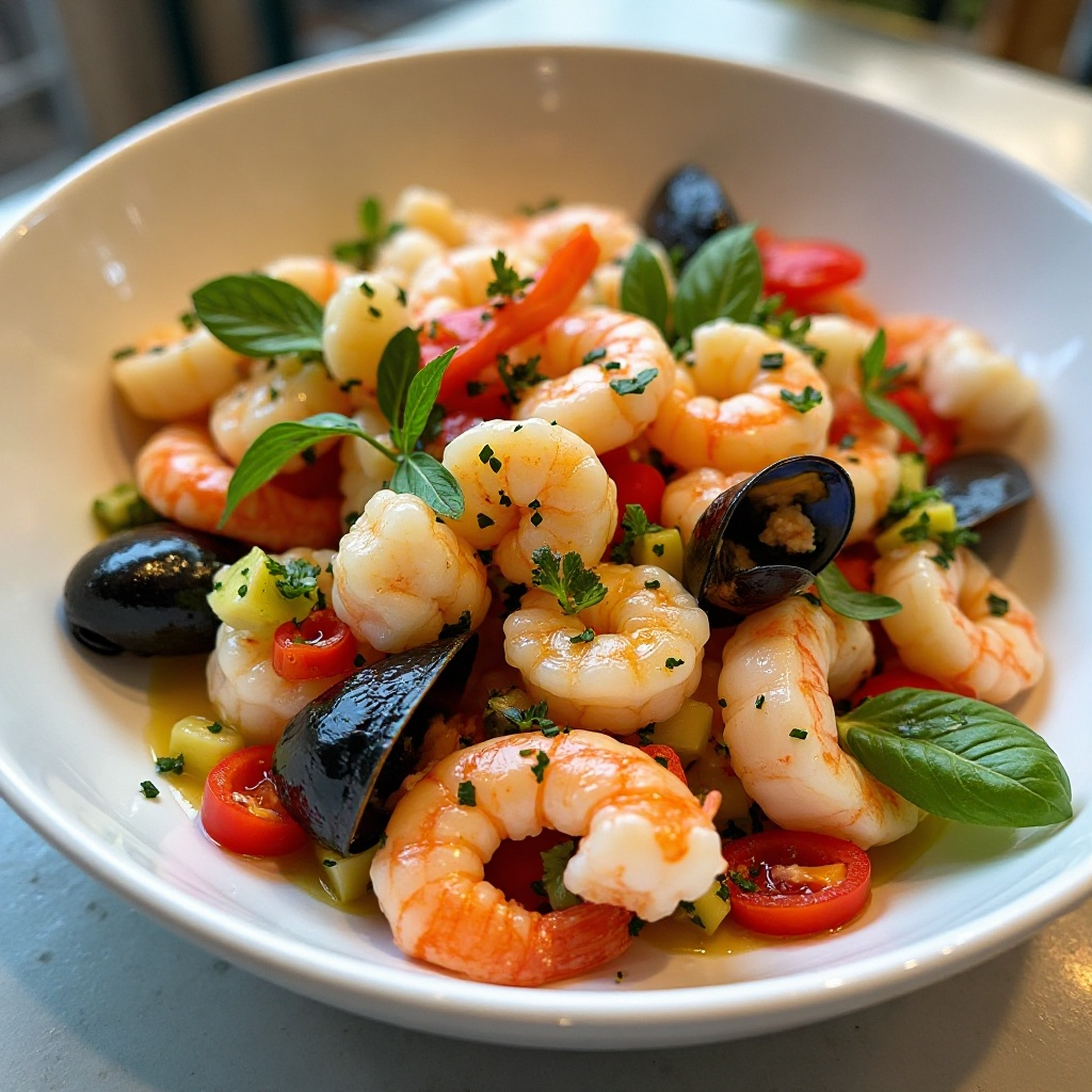 6. Sirve el ceviche frío, preferentemente en un plato que destaque sus colores naturales, como el azul del marisco y los tonos vibrantes de los vegetales.