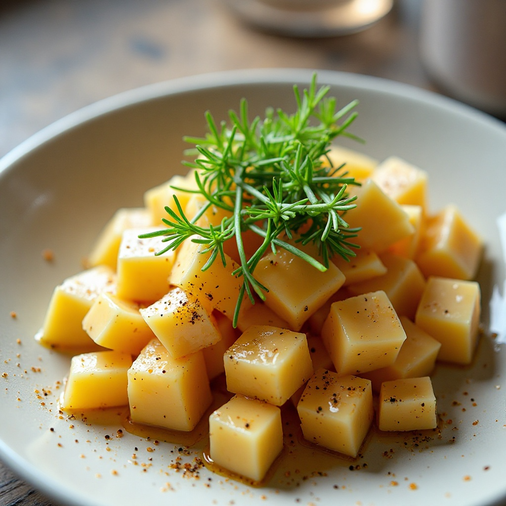 5. Sirve los cubos de queso con un chorrito de aceite de sésamo y cebollitas de eneldo fresco, si lo deseas.