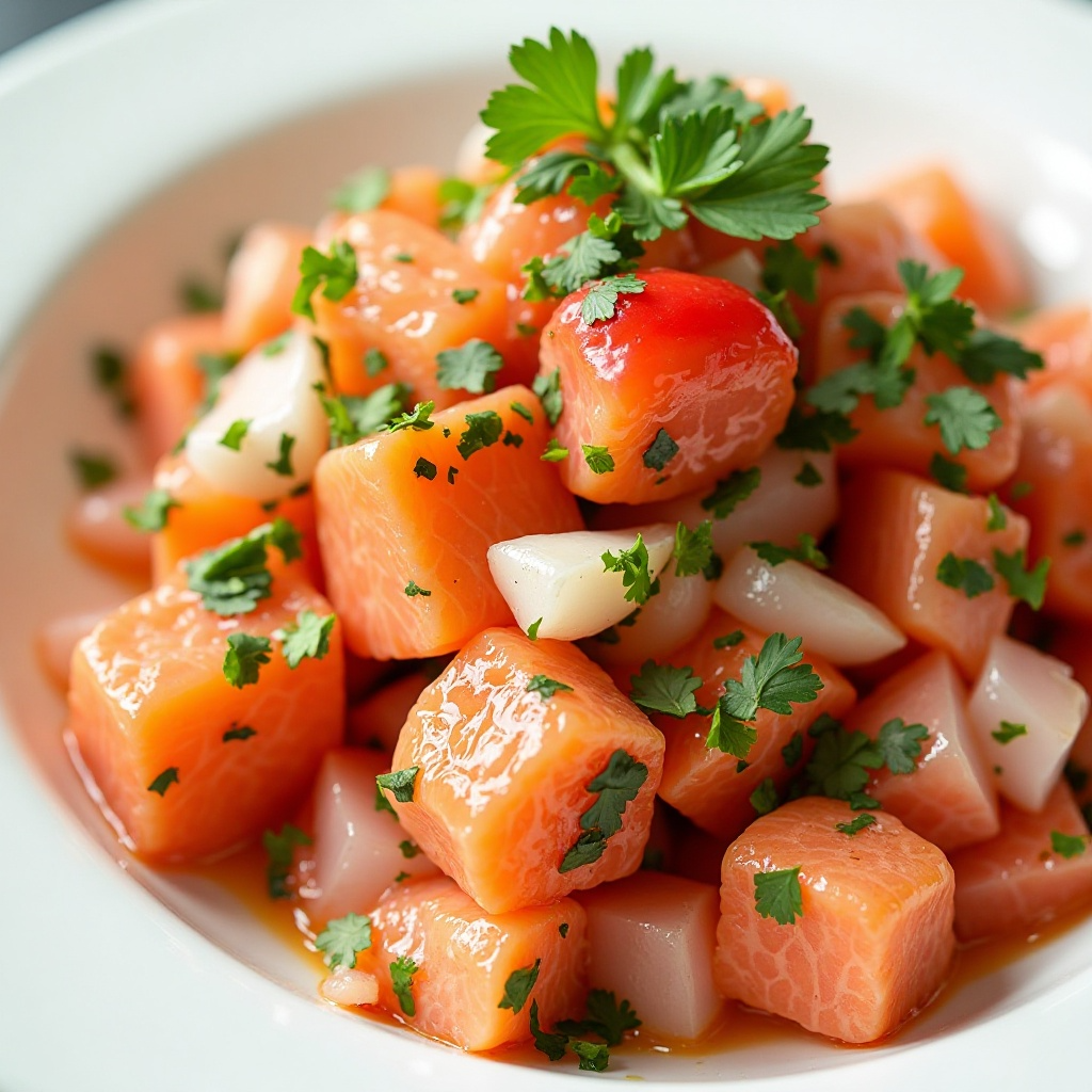 El salmón es rico en ácidos grasos omega-3, esenciales para la salud del corazón y el cerebro. Los vegetales frescos como el pimiento rojo y la cebolla morada aportan vitaminas y antioxidantes. Esta versión ligera de ceviche puede disfrutarse sin complicaciones dietéticas, ofreciendo un plato equilibrado.