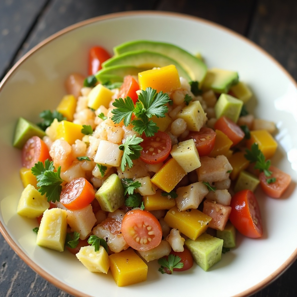 El ceviche es un plato rico en proteínas y ácidos grasos omega-3, fundamentales para una dieta equilibrada. Los ingredientes frescos como el pescado, aguacate y vegetales proporcionan una variedad de vitaminas y minerales esenciales. Para adaptar esta receta a necesidades dietéticas específicas, se puede reducir el ají dulce o ajustar la cantidad de aceite de oliva.