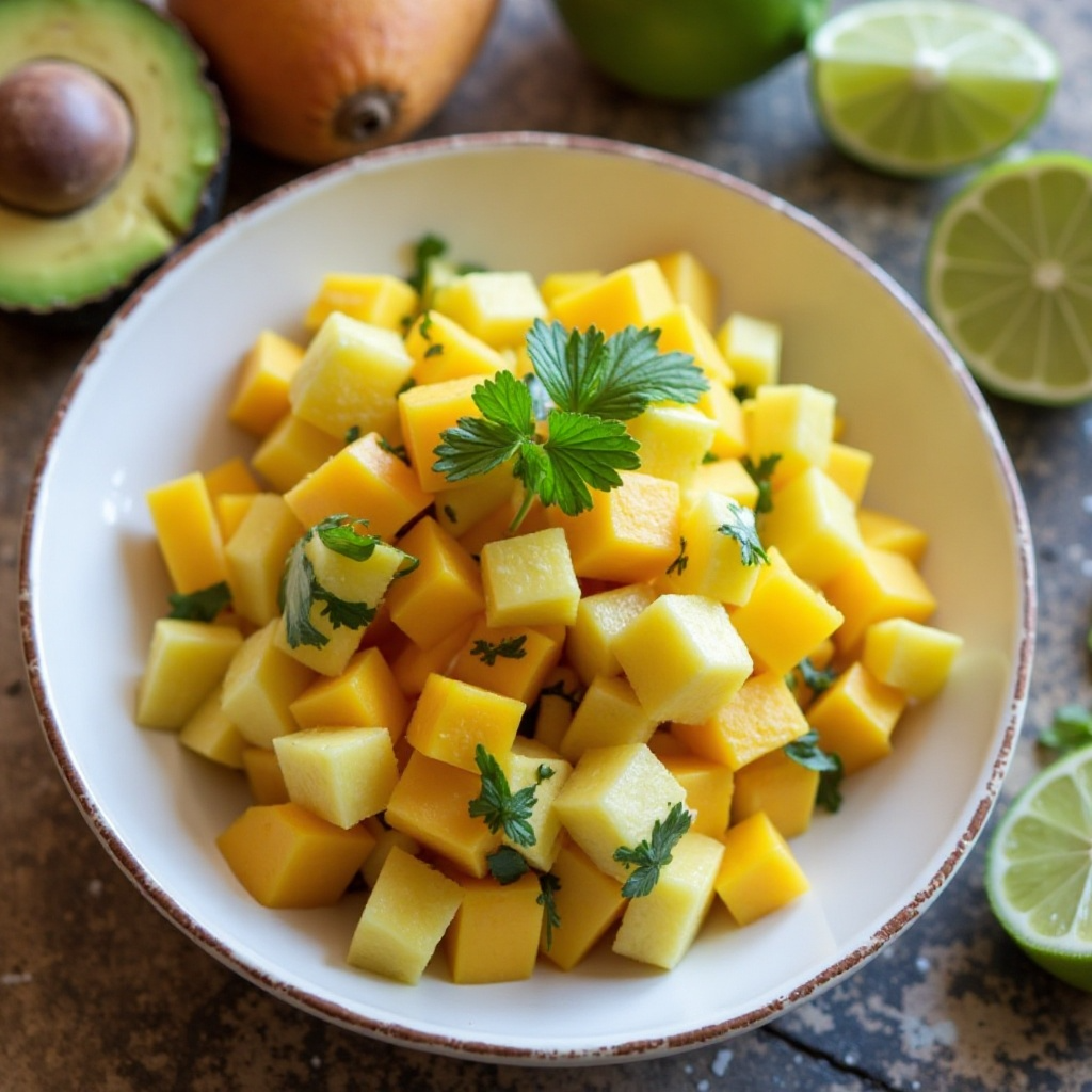 - En un tazón grande, coloca los cubos de piña, mango y aguacate.