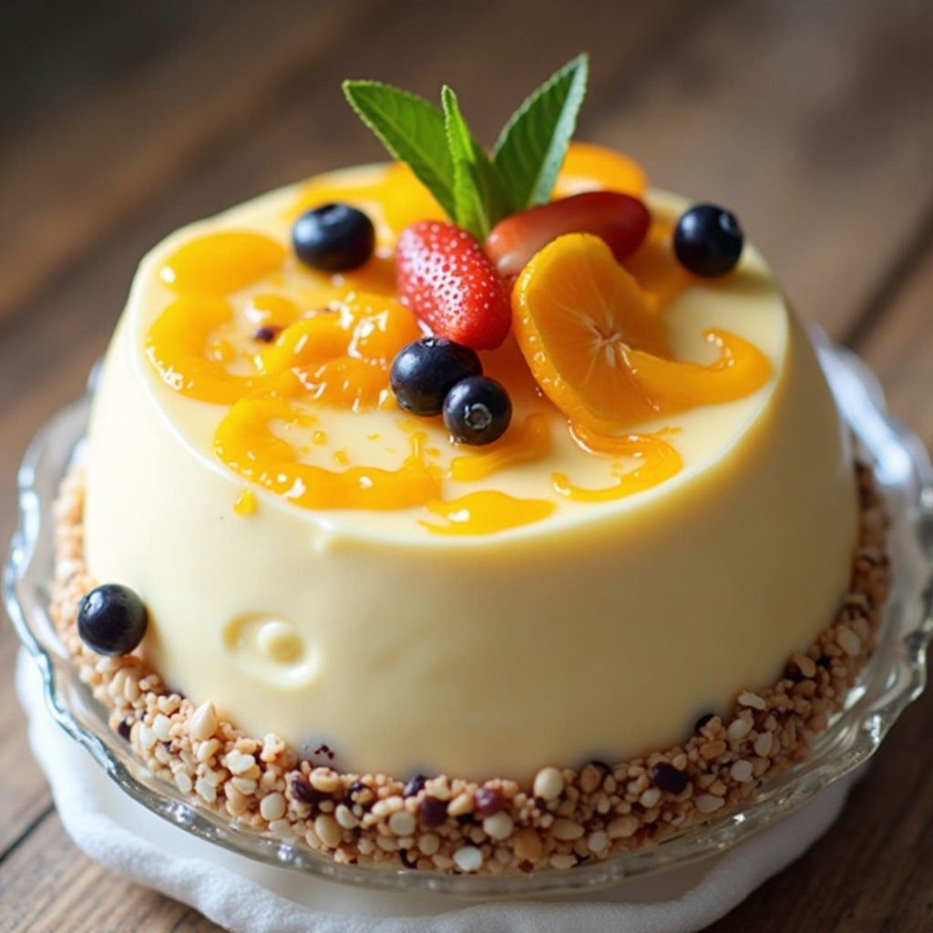 - Coloca la crema en el molde, decora con frutas frescas y cáscaras de cítricos si lo deseas, y refrigera durante al menos 4 horas o hasta que esté firme y fría.