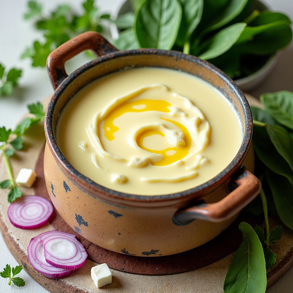 6. Sirve la fondue en un recipiente con cubitos de hielo para mantenerla fresca. Sirve acompañada con espinacas frescas, cebolla morada y aceite de oliva para freír.