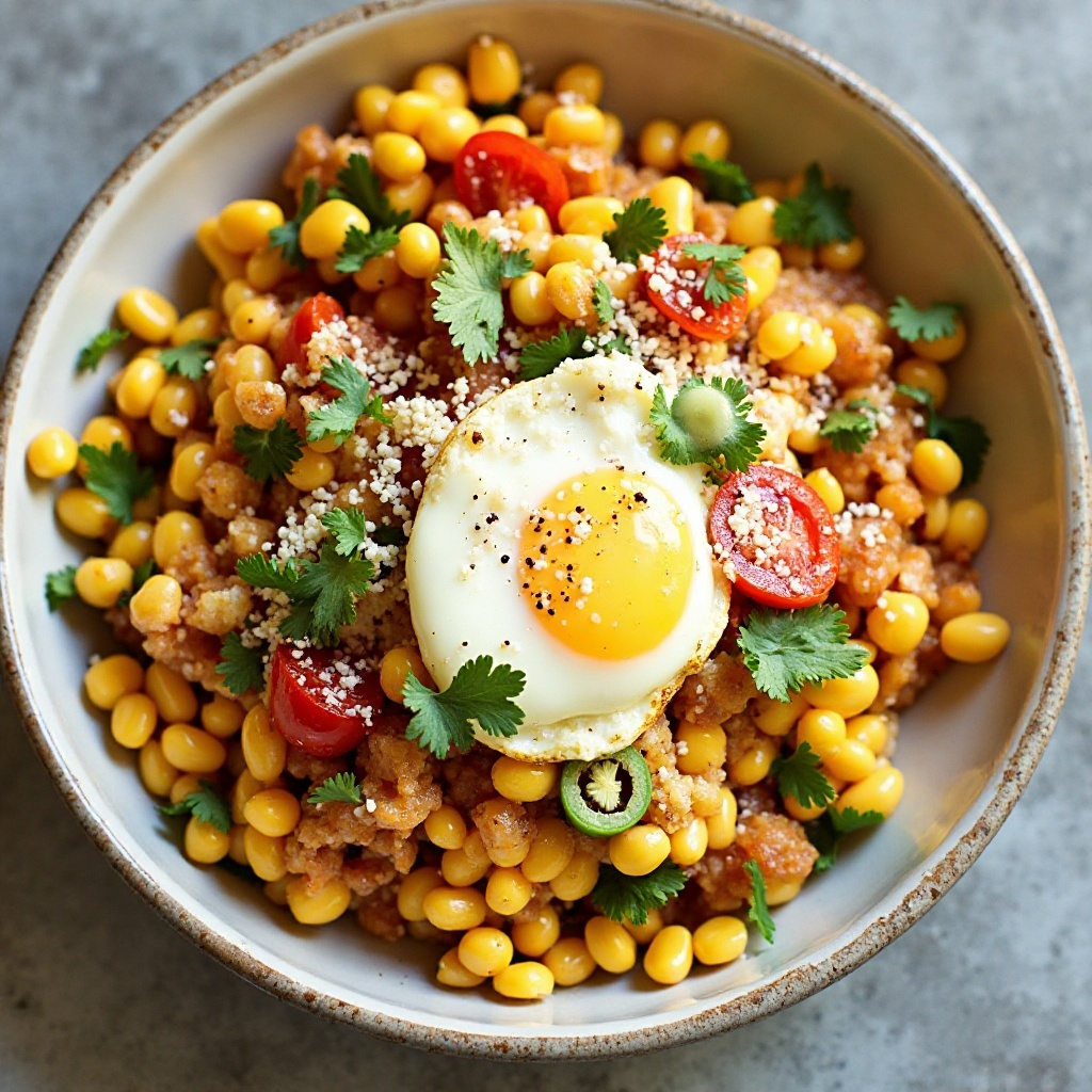 El uso de maíz dulce en lugar del tradicional maíz blanco le da un perfil nutricional único, rico en vitaminas y minerales. Los huevos son una buena fuente de proteínas, mientras que el aguacate contribuye con grasas saludables. Para adaptar la receta a dietas bajas en calorías, considera reducir la cantidad de salsa y aumentar las porciones de vegetales.