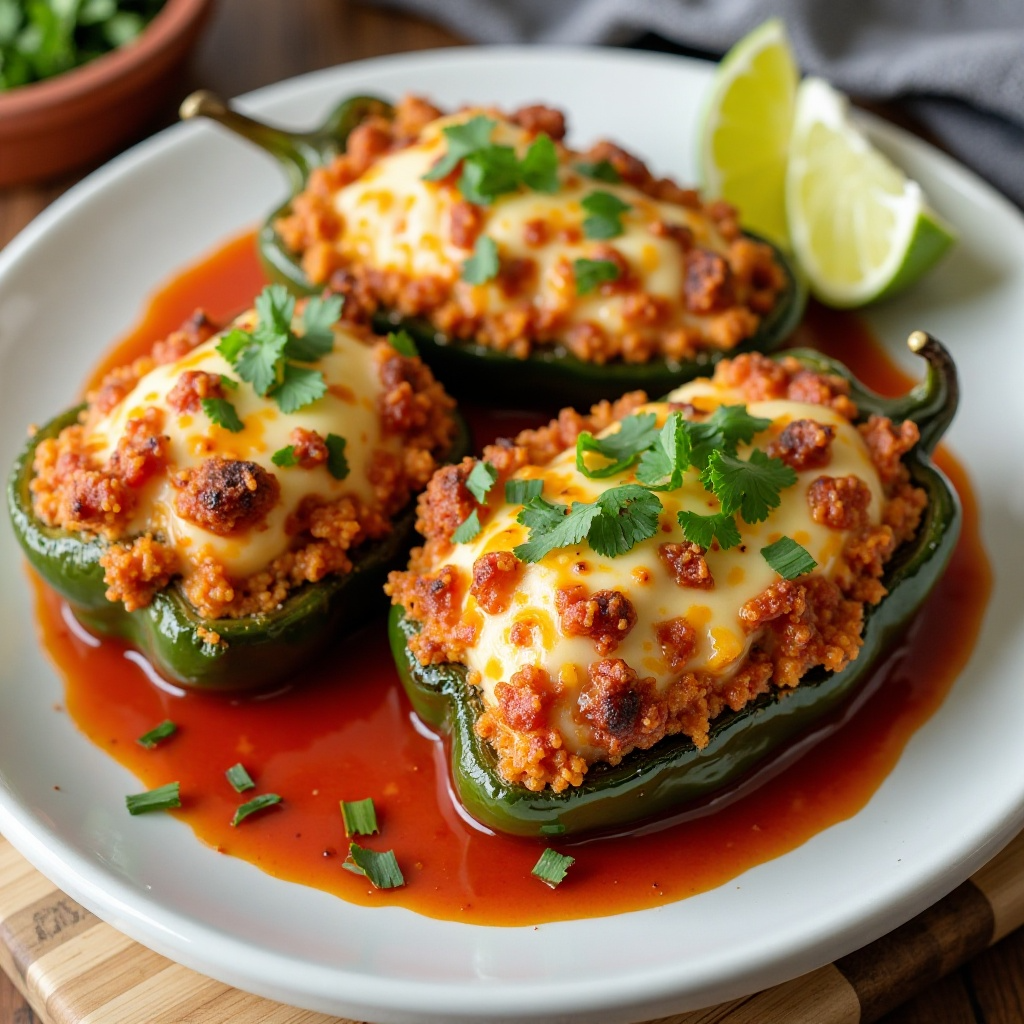 - Sirve los chiles rellenos calientes, acompañados de una rodaja de lima fresca y unas gotas de limón para añadir un toque ácido y refrescante.